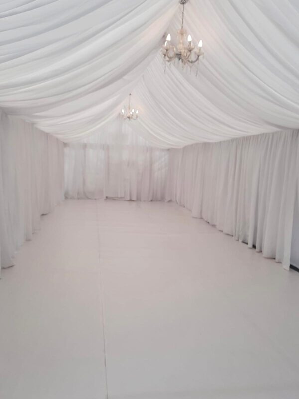 Onze Luxe Tenten inclusief Drapering zijn ontworpen om elk evenement een stijlvolle en verfijnde uitstraling te geven. Deze ruime tenten zijn perfect voor bruiloften, feesten en andere speciale gelegenheden. De zachte, vloeiende drapering aan het plafond en langs de zijwanden creëert een elegante sfeer die iedere ruimte omtovert tot een magische setting.